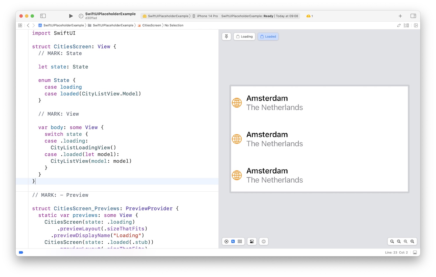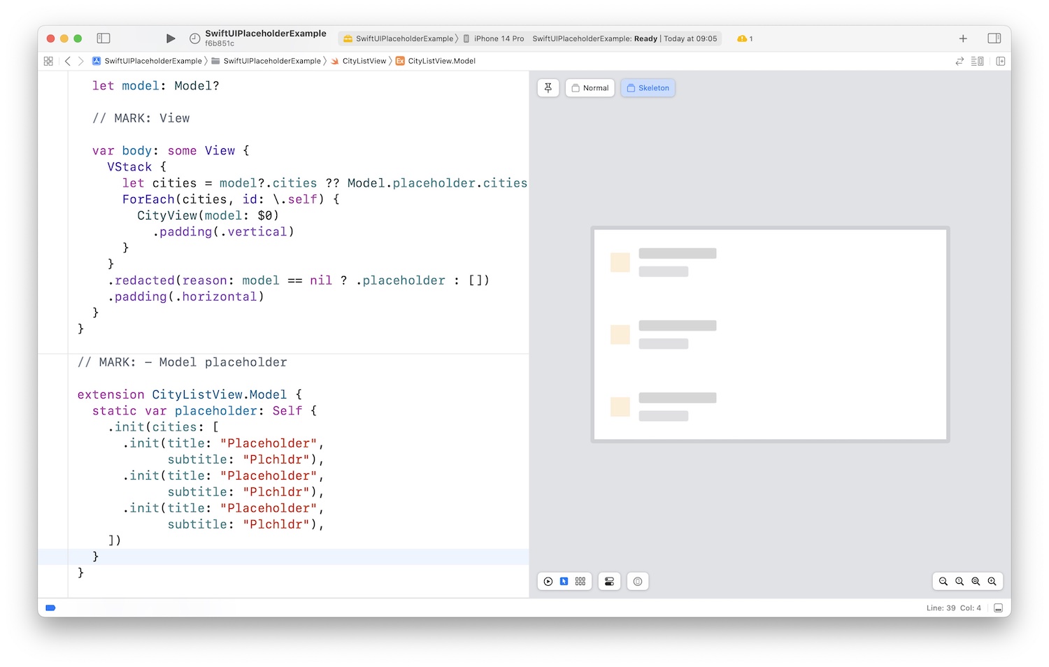Alternatively, for more flexibility, we can create a separate view specifically for the loading state. In this case, we can use a CityListLoadingView that holds CityListView with a placeholder model and applies the .redacted(reason: .placeholder) modifier to it.