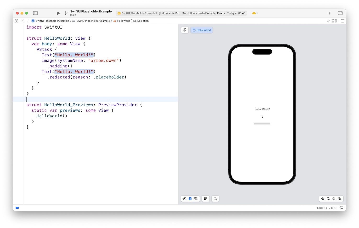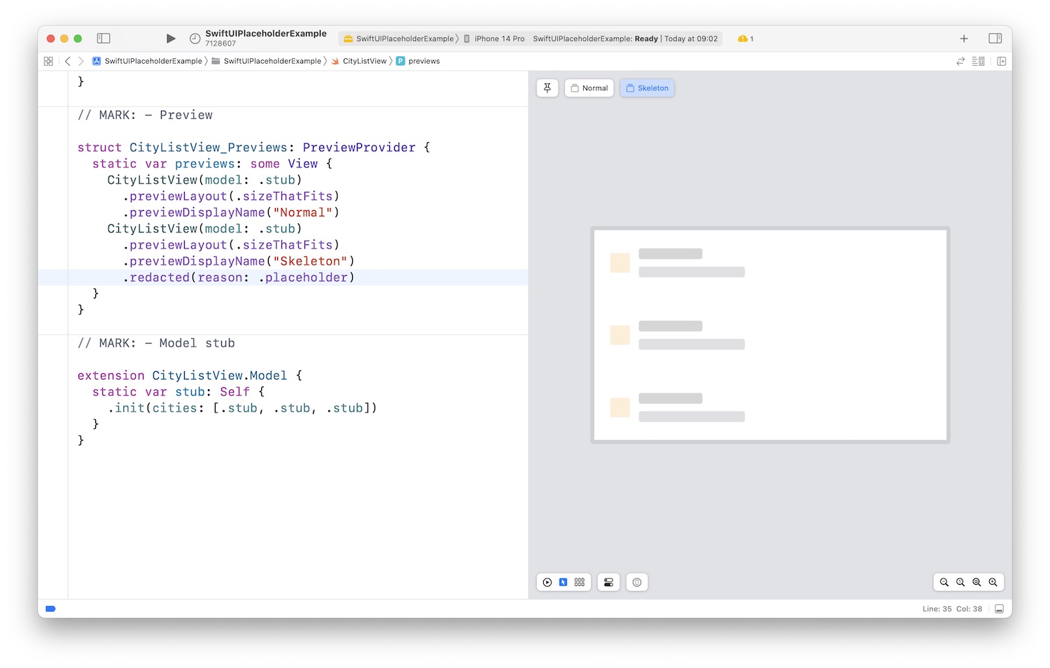By adding the .redacted(reason: .placeholder) modifier to this view, we can visualize both the skeleton state and the actual content using SwiftUI’s Preview feature.